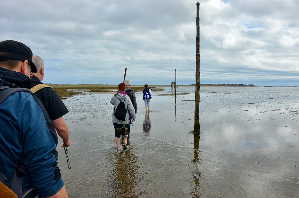 The weather was kind to us and around half of the pilgrims walked across the causeway on the three miles of the Pilgrims’ Route, led in prayer and hymns by Endre and guided safely by Mike Robe from the SVP Centre on Holy Island and his team, using hand-held radios. Their help and care were much appreciated by everyone as the terrain became demanding. Apparently storm ‘Arwen’, back in November 2021, was responsible for the shifting the sandbanks of the Pilgrim Route, making the walk difficult in parts. We did all make it across safely!